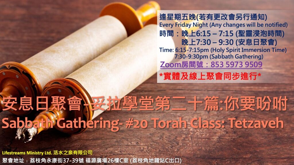 This week’s Torah class will move on to the 20th Torah: Tetzaveh. All family members who wish to study together are welcome to join us in person or via Zoom! Remember to bring your Bible and notebook to jot down important things and what God wants to tell you! See you all on Friday!